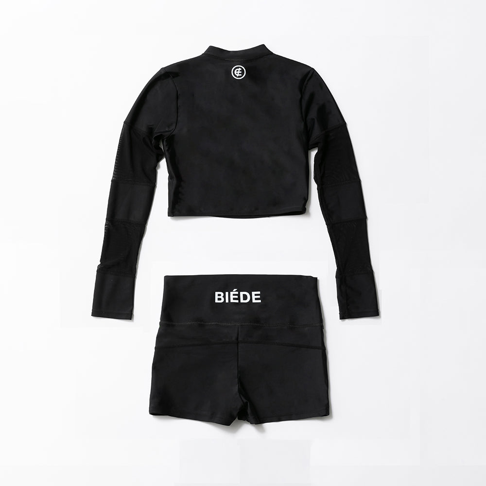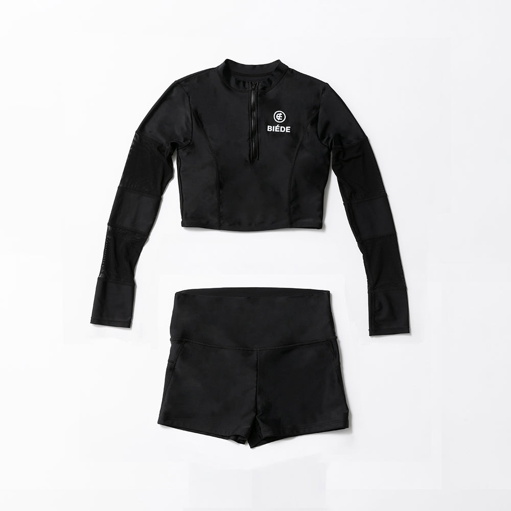 「現代人の日常の中でのフィットネス」をコンセプトとしたセパレートのスイムウェア。ラッシュガードとしても着られるロングスリーブ型のトップスとボトムとのセット。BIÉDEのロゴとシンボルマークのみのシンプルなユニフォームとしてのデザイン。クルーネックでフロントにはジップが付いています。伸縮性のある生地で、水泳や水の中でのウォーキング、アクアビクスなどで快適に過ごすことができます。差し込み型のカップが付いています。